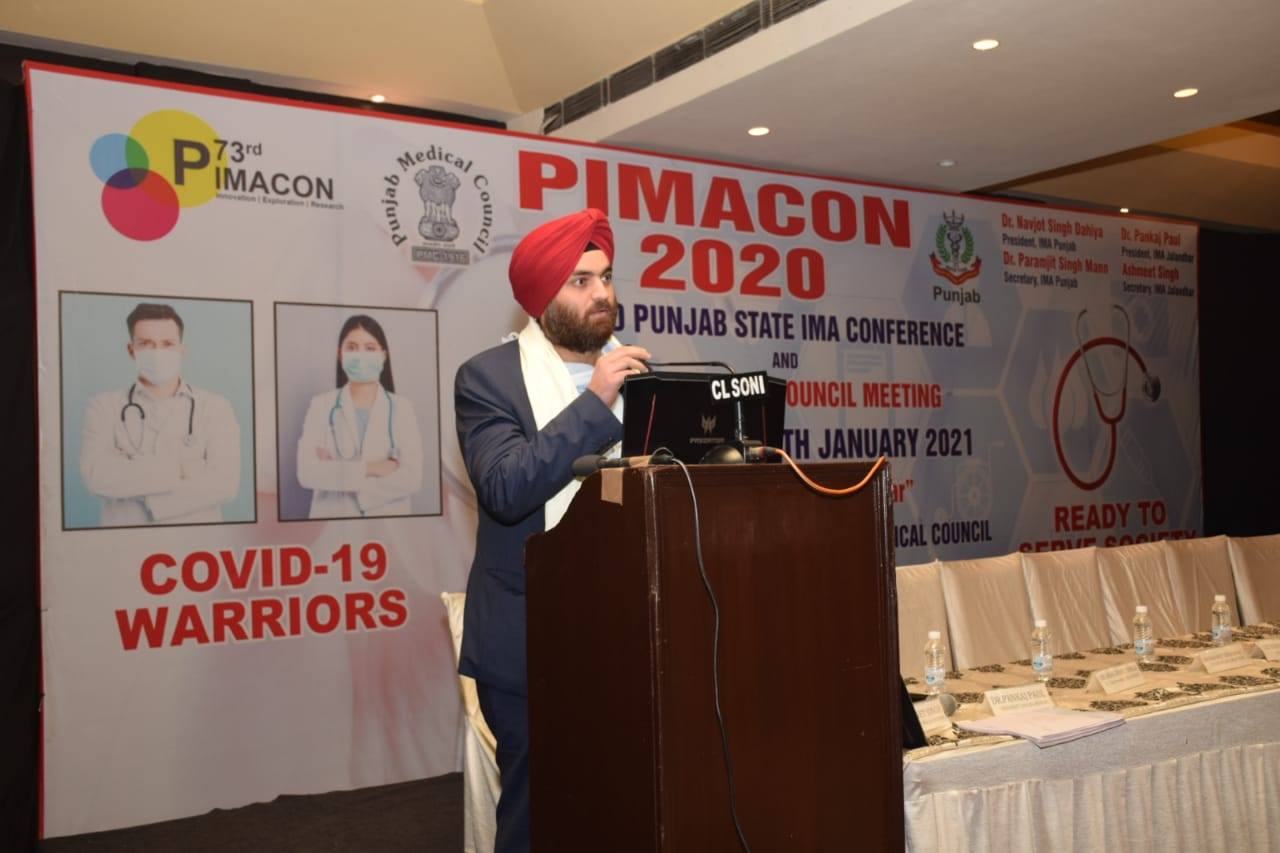 Dr Gubeer Gill welcoming the chief guest Sh. Husan Lal ji Chief Secretary Health Punjab along with national President of IMA and other dignitaries. They released the PIMACON Sovenier of year 2020.